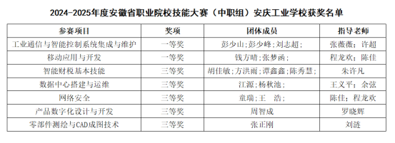 2024-2025年度安徽省職業(yè)院校技能大賽(中職組)于近日落幕。安慶工業(yè)學(xué)校參賽師生憑借高超的專(zhuān)業(yè)技能取得優(yōu)異成績(jì),共獲得7個(gè)獎項。其中,一等獎2項,三等獎5項,創(chuàng )該校近年來(lái)最好成績(jì)。