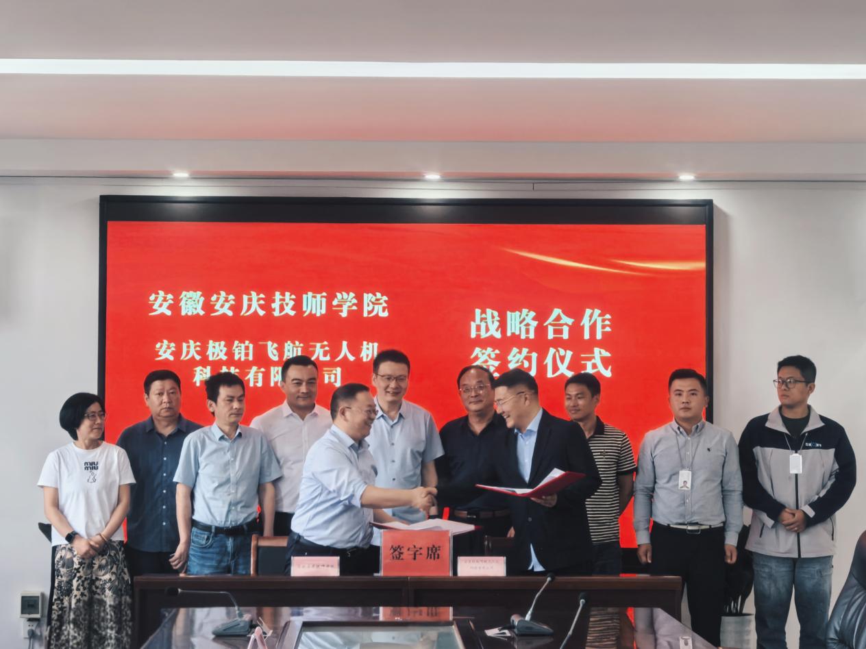 為推動(dòng)無(wú)人機技術(shù)領(lǐng)域高素質(zhì)人才培養,5月13日,安慶技師學(xué)院與安慶極鉑飛航無(wú)人機科技有限公司,正式簽署戰略合作協(xié)議,雙方將圍繞產(chǎn)教融合、人才共育等方向開(kāi)展深度合作,共同探索無(wú)人機技術(shù)應用領(lǐng)域的創(chuàng )新發(fā)展路徑。學(xué)院黨委副書(shū)記、院長(cháng)徐英武攜院領(lǐng)導班子成員及相關(guān)部門(mén)負責人,安慶極鉑飛航無(wú)人機科技有限公司總經(jīng)理胡應日攜相關(guān)部門(mén)負責人,出席此次簽約儀式。